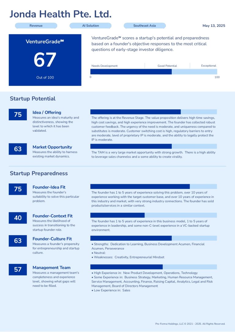 As a physician and health tech leader, our founder saw how fragmented, unstructured health data delays care, overwhelms clinicians, and makes real-world AI nearly impossible. Motivated by personal experience managing autoimmune conditions and supporting a loved one through late-stage cancer, she co-founded Jonda Health to bring clarity to health data—starting with lab results trapped in PDFs. Our team blends clinical, technical, and operational expertise with a shared commitment to health equity. We’ve launchedthe product, are revenue-generating, ISO 27001 certified, and support multiple languages. Clients include care management systems and research platforms aiming to reduce manual work and improve data interoperability. We’ve validated demand through trials and secured strategic partnerships. While still optimizing for product-market fit, we’ve seen strong early traction. Our greatest need now is capital to scale the team and technology to serve high-volume health systems with confidence.
