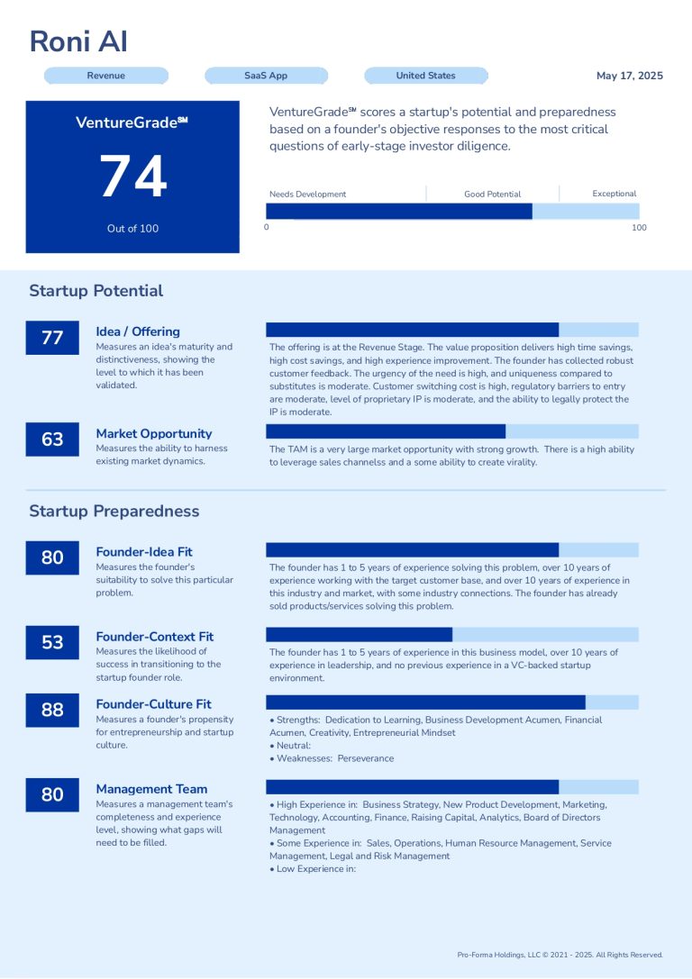 Roni AI’s exit strategy includes acquisition by fintech leaders like Intuit, Xero, or Stripe, or integration into platforms like Shopify or Brex to enhance SME financial tools. We’re also positioned for interest from private equity or regional banks seeking AI-driven solutions to serve the fast-growing SME market.